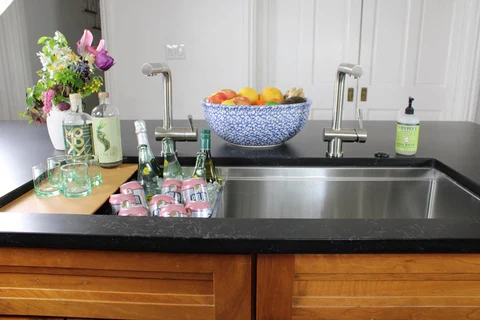 Durable, moisture-friendly surfaces that add warmth and bring the whole room together.